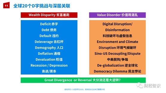 其实,今天全球面临的很多挑战其实都可以用字母D来代表。蓝色框里这一类是经济学家过去谈论比较多的。是赤字、债务、违约,我们都知道最近中国有一些国企面临连环违约的问题。