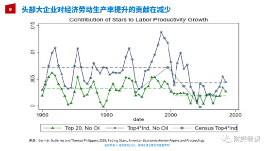 更加要命的问题,过去我们希望通过科技创新能够带动劳动生产率的提高,我们说科学是第一生产力。可是数据非常清晰地告诉我们,其实头部企业在过去二十年时间,它们的规模越来越大,它们的财富越来越多,但是对劳动生产率的贡献却在减小,相对于过去历史上其它的大企业。原因还是我刚才讲的经济中间过度储蓄、贫富差距导致了总需求的不足。