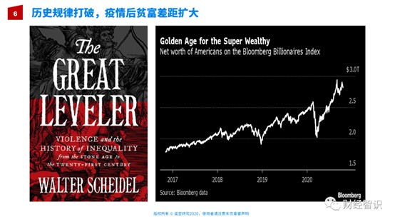 理解这一点以后,在今年的疫情过后全球的贫富差距其实反而打破了历史的规律,变得越来越扩大了。历史的规律是什么呢?斯坦福大学历史学教授有一本书,书的名字叫做《The GREAT LEVELER》(《大平衡器》),国内中信出版社把它翻译过来,叫《不平等社会》。