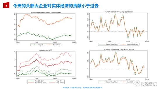 研究发现无论怎么去衡量,现在特别是2000年以后的大企业,它们对实体经济,对其它企业的帮助其实是越来越少了。原因并不太明显,因为我们一方面感受到大企业带来生活中效率的提高,但是大企业的垄断性也越来越强了。