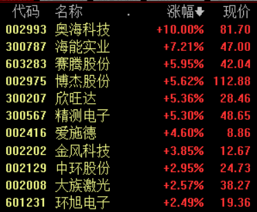 12月15日午后,苹果概念股走高,截至发稿,赛腾股份涨近6%,欣旺达、精测电子、蓝思科技、博杰股份等跟涨。