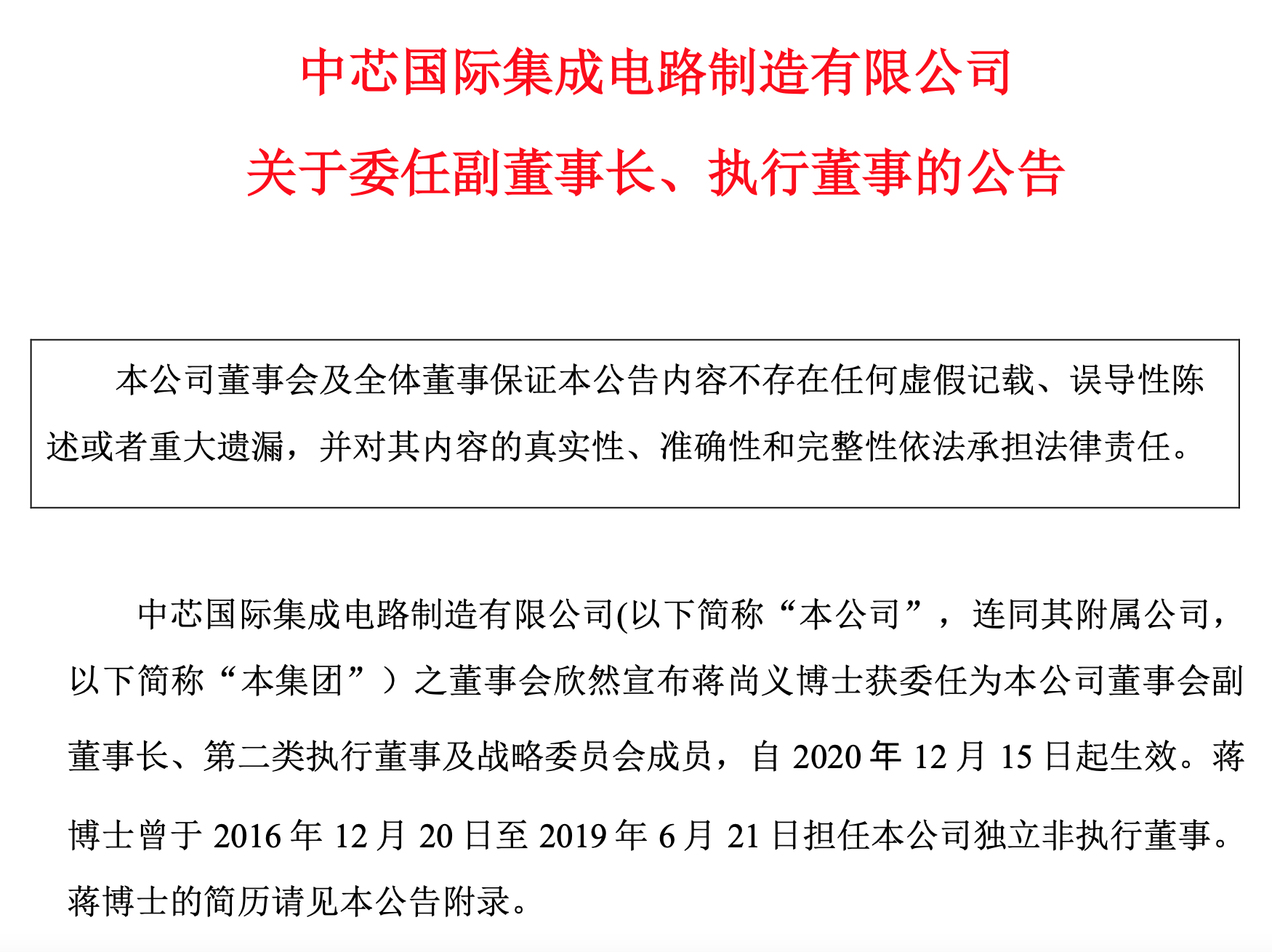 此外,中芯国际同时发布公告,公司董事会宣布蒋尚义获委任为公司第二类执行董事、董事会副董事长及战略委员会成员,自2020年12月15日起生效。