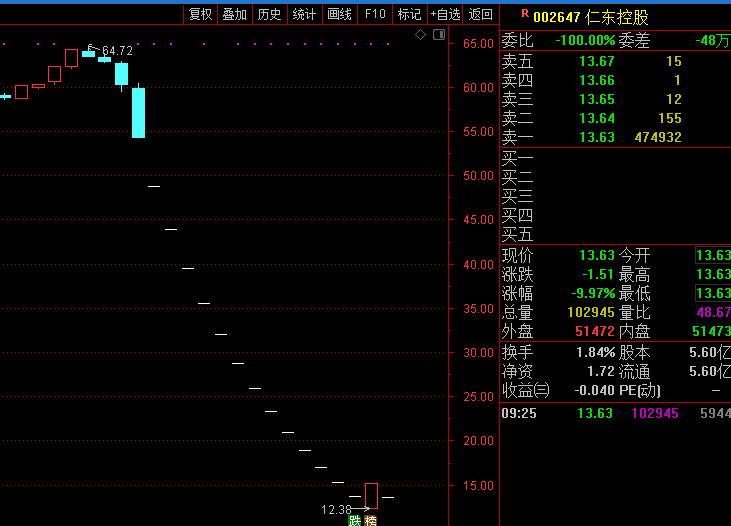 周三早盘,昨日上演绝地反击的仁东控股跌停开盘。集合竞价结束后,跌停板封单高达47.49万手,粗略计算,卖盘资金超过6亿元。