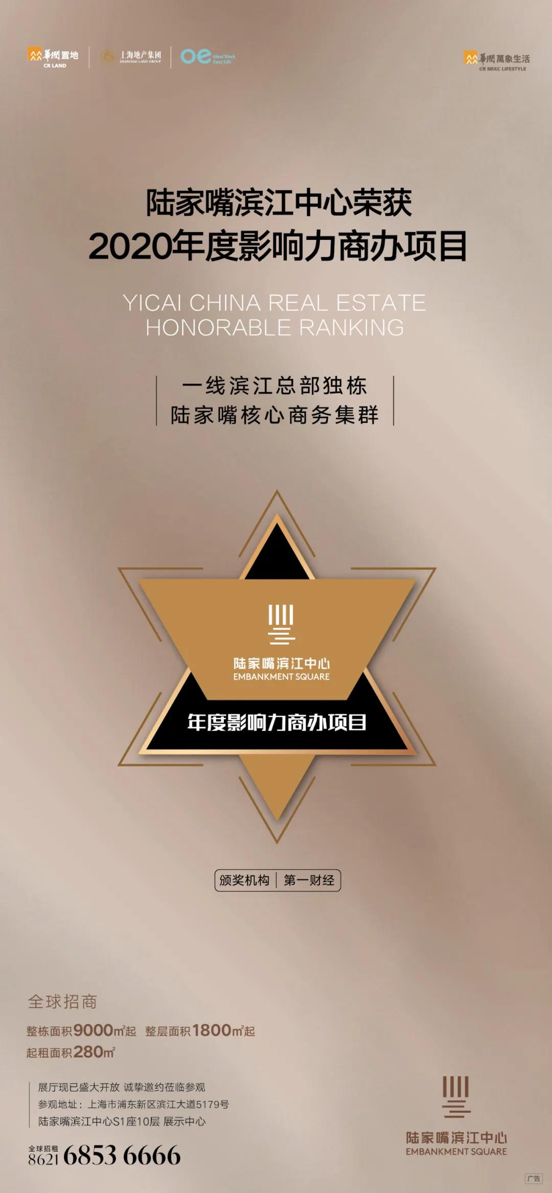 第14届《第一财经·中国房地产荣耀榜》综合了经营战略、产品创新、城市贡献、项目价值等一级指标,以及定位、区位、规划、设计、运营、管理、服务、品质等二级指标,评选出“年度影响力商办项目”。陆家嘴滨江中心以突出的区位优势、多元的楼宇空间、前瞻的办公生态和创新的招商理念摘得该奖项。