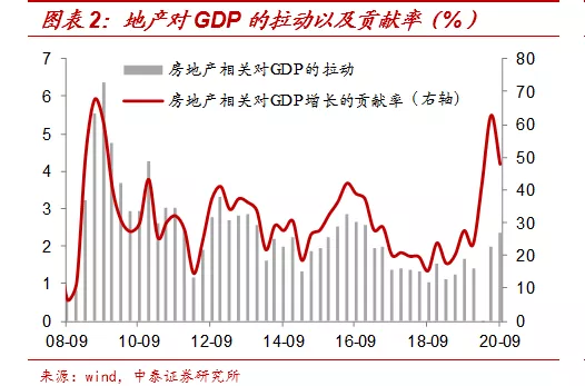 会议同时强调,“疫情变化和外部环境存在诸多不确定性,我国经济恢复基础尚不牢固”。虽然经济在持续修复,但驱动经济修复的主要动力在投资。前三季度最终消费支出对GDP同比的拉动为-2.4%,处于历史低位,而资本形成总额对GDP同比的拉动则达到3%。而固定资产投资中又属地产投资最为强劲,前11月固定资产投资累计增速为2.6%,房地产投资增速达到了6.8%。从对经济增长的贡献角度来看,如果把地产对其他产业的拉动考虑在内,二季度房地产对GDP增长的贡献超过60%,三季度仍然接近50%。