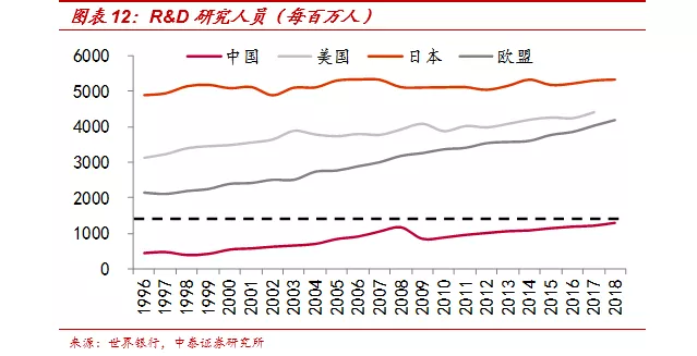 在科技发展方面,与去年“深化科技体制改革”、“加快科技成果转化”不同的是,本次会议提出“坚持战略性需求导向”、“发挥新型举国体制优势”,说明更加强调从需求角度加大力量,解决“卡脖子”难题。例如,在科研人员方面,中国与发达成员也存在较大差距,2018年我国每百万人中科研人员仅1307人,不及美日欧90年代水平。