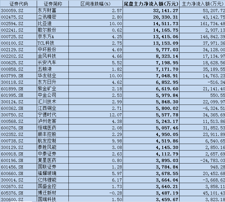 今日主力资金尾盘净流入15.56亿元,创业板指午后走高,最终收于2882.44点,涨幅3.66%。从主力资金尾盘净流入的情况来看,东方财富获主力净流入3.2亿元居于首位,今日涨幅近2.6%,立讯精密、比亚迪、歌尔股份、TCL科技、汇川技术等科技股在列。相反,仁东控股尾盘遭抛售5.9亿元居首,老白干酒、贵州茅台、天齐锂业、恒轩科技、分众传媒、皇台酒业、中芯国际尾盘遭主力净流出额度居前。
