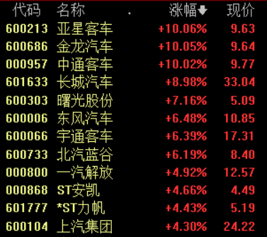 12月23日,汽车板块持续走高,截至发稿,亚星客车、中通客车等涨停,长城汽车涨近9%,东风汽车、宇通客车涨超6%。港股汽车股也同步走高,长城汽车涨超9%,吉利汽车涨近6%,比亚迪股份涨超3%。