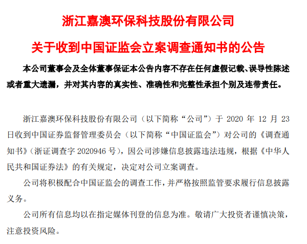 嘉澳环保12月23日晚间发布公告称,公司于12月23日收到证监会对公司的《调查通知书》,因公司涉嫌信息披露违法违规,根据有关规定,决定对公司立案调查。