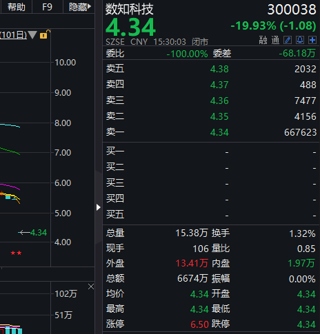 盘面上,数知科技一字跌停。截至今日收盘,报4.34元,跌19.93%,股价创出7年新低。