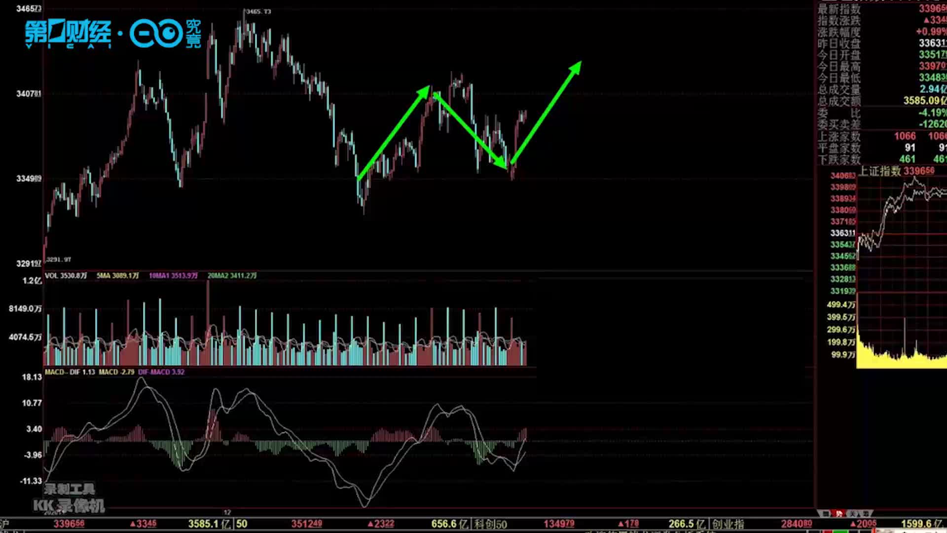 周五上证指数低开高走,涨了33个点,创业板指数涨幅相对小一些,整体来看的话,目前它也是属于创低以后的短线反弹。