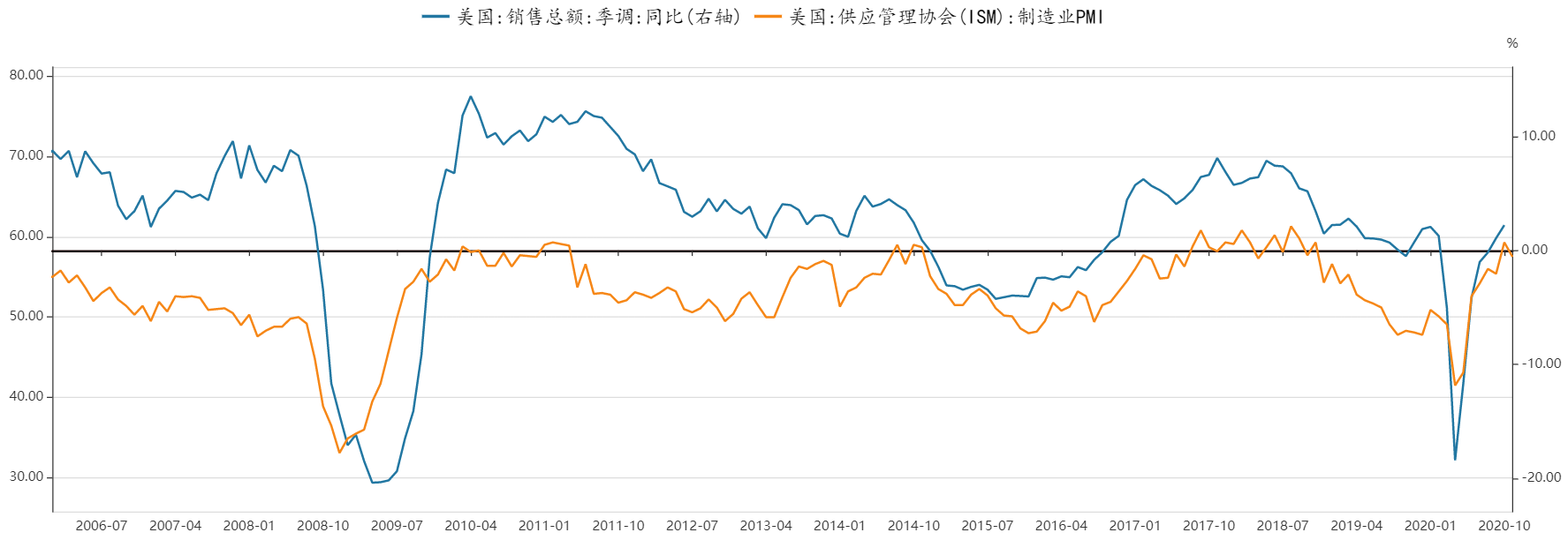 但9-11月份,美国通胀并没有快速上行,原因在于疫情的反复与财政政策的退出,影响了美国市场再通胀预期。美国通胀预期9-11月份维持在1.6%-1.8%区间震荡,11月ISM PMI及零售销售同比开始回落。