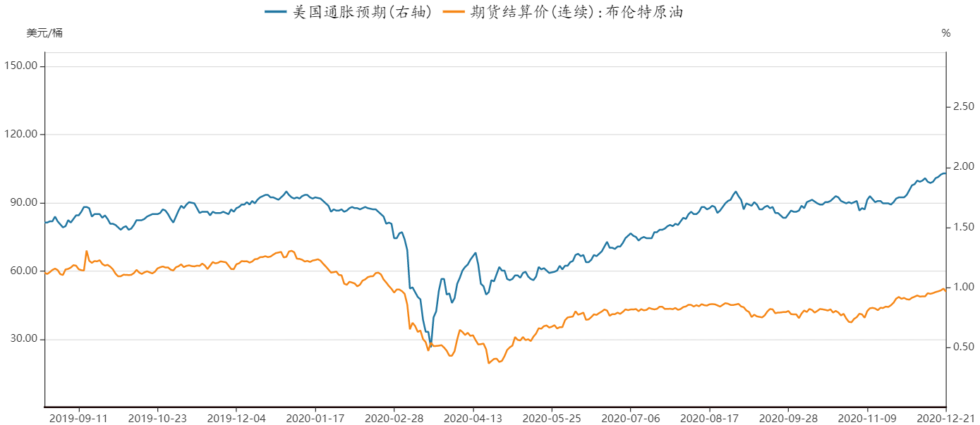 直到12月,随着疫苗出现,美国通胀预期开始慢慢抬头。12月11日,继英国之后,美国FDA宣布批准紧急授权美国辉瑞公司和德国的BioNTech公司联合开发的新冠病毒疫苗,12月中下旬开始,欧美国家正式开始疫苗接种。另外,在美国确诊与死亡病例持续创新高,11月份经济增速减缓背景下,本已搁浅的财政纾困计划发生转机——12月17日美国多位国会议员及助手表示,国会谈判代表“接近于”就一项9000亿美元的新冠援助计划达成协议,其中包括发放600至700美元刺激支票和延长失业救济。同时,拜登组阁后,任耶轮为财政部部长,助推市场通胀预期回升——美国通胀预期于12月1日突破前期高点,布伦特油价也紧随其后,于12月3日突破前期高点,并于12月10日站上50美元/桶。