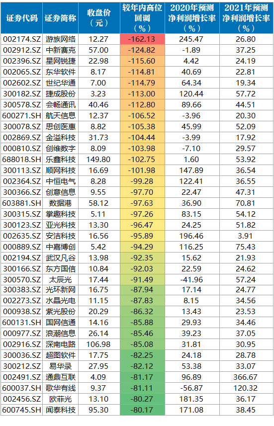数据统计显示,在5G及5G应用板块中,今年前三季度净利润为正且最新价较年内高点回调超50%的个股有77只,其中,回调幅度超80%的个股有以下35只个股。
