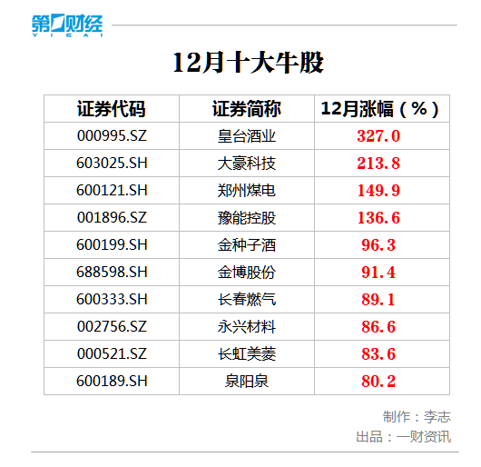 在剔除最近半年上市的新股后,十大牛股12月份涨幅均超过了50%,涨幅超过100%的有4只。从榜单来看,白酒股、煤电股占据大半席位。