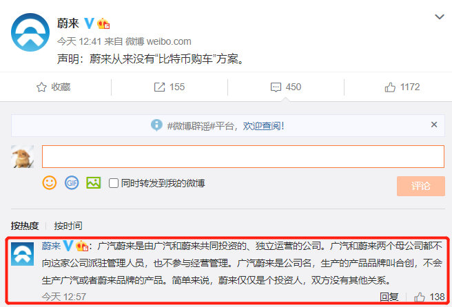 随后蔚来下场了,中午,蔚来发布声明澄清称,蔚来从来没有“比特币购车”方案。广汽和蔚来两个母公司都不向这家公司派驻管理人员,也不参与经营管理。广汽蔚来是公司名,生产的产品品牌叫合创,不会生产广汽或者蔚来品牌的产品。简单来说,蔚来仅仅是个投资人。