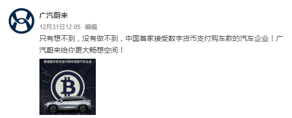 12月31日早上10点,广汽蔚来在微博官宣,成为中国首家接受比特币支付购车款的汽车企业,并配上相应图片文案。