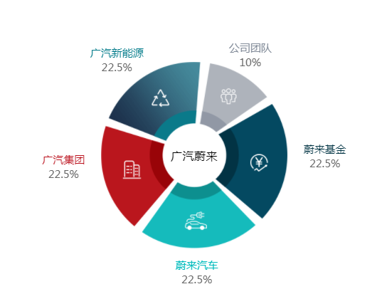 公开资料显示,广汽蔚来成立于2018年4月,注册资本5亿元,由广汽集团、广汽新能源、蔚来汽车、蔚来基金共同出资成立,分别占股22.5%,公司团队持股10%。