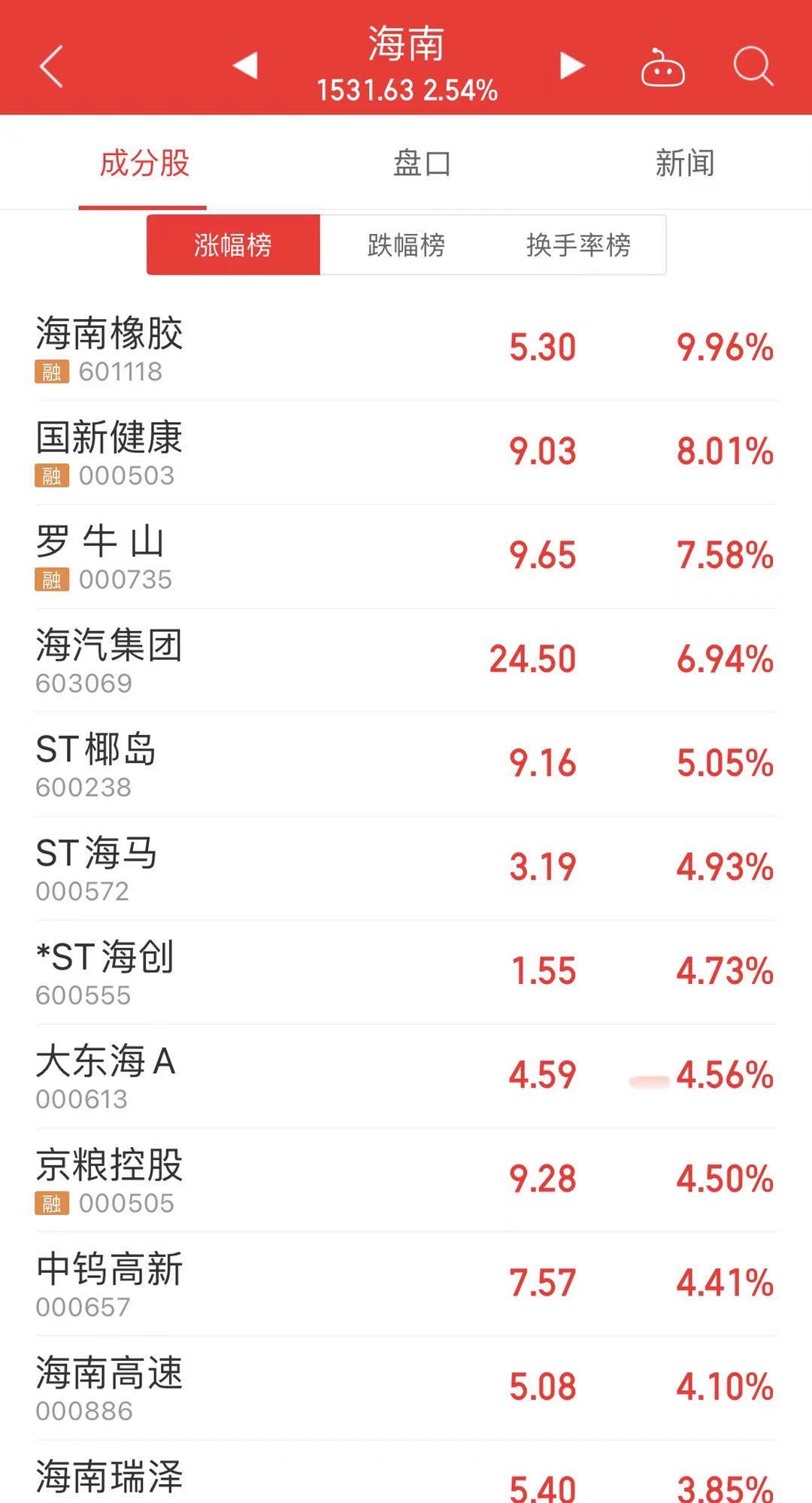 1月4日午后,海南板块异动拉升,截至发稿,海南橡胶涨停,国新健康涨逾8%,罗牛山涨超7%,神农科技、海南瑞泽等多股纷纷跟涨。