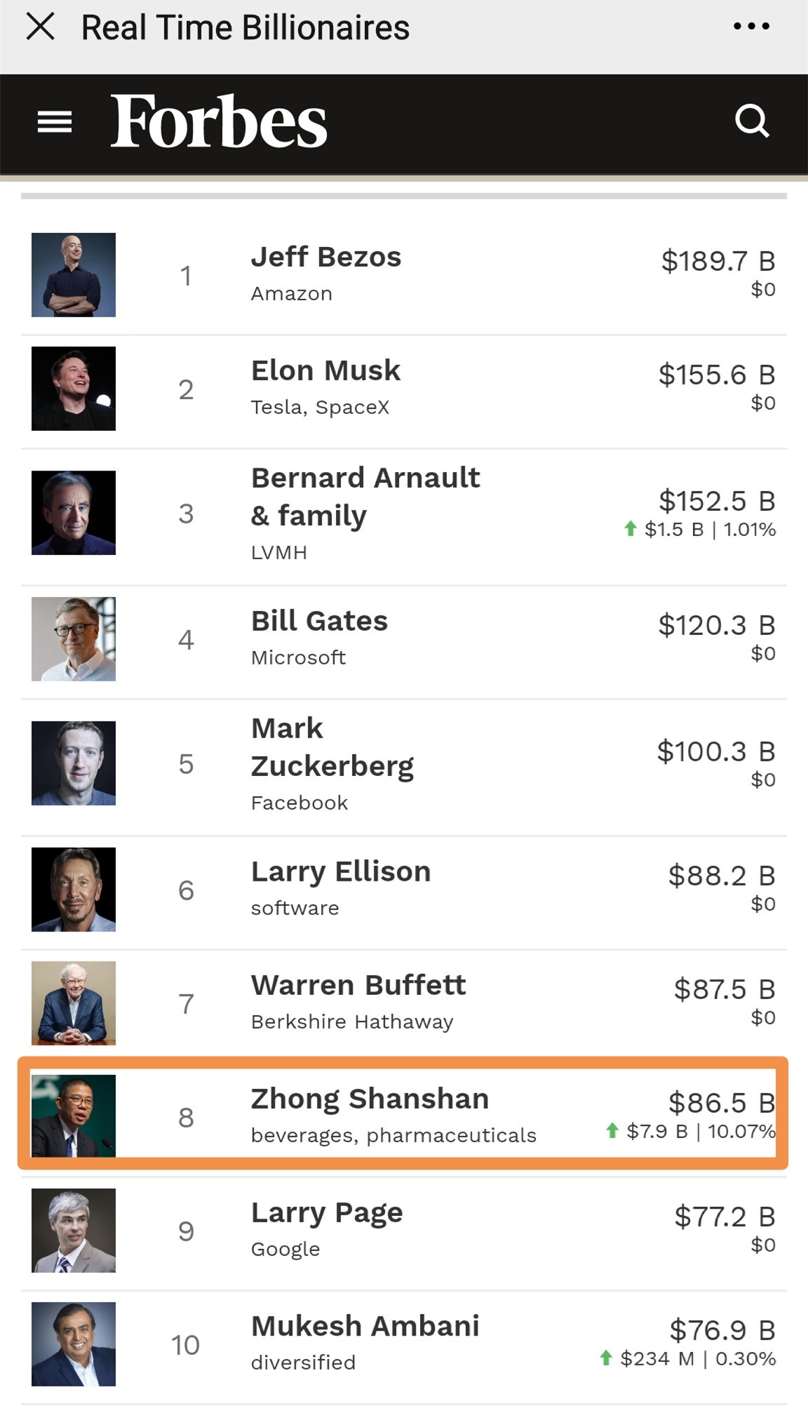 随着农夫山泉股价大涨,其创始人钟睒睒的身价也水涨船高。福布斯实时富豪榜显示,钟睒睒以840亿美元身家跻身全球富豪榜第八位,逼近排在第七的沃伦·巴菲特875亿美元身家,超越谷歌创始人拉里·佩奇。