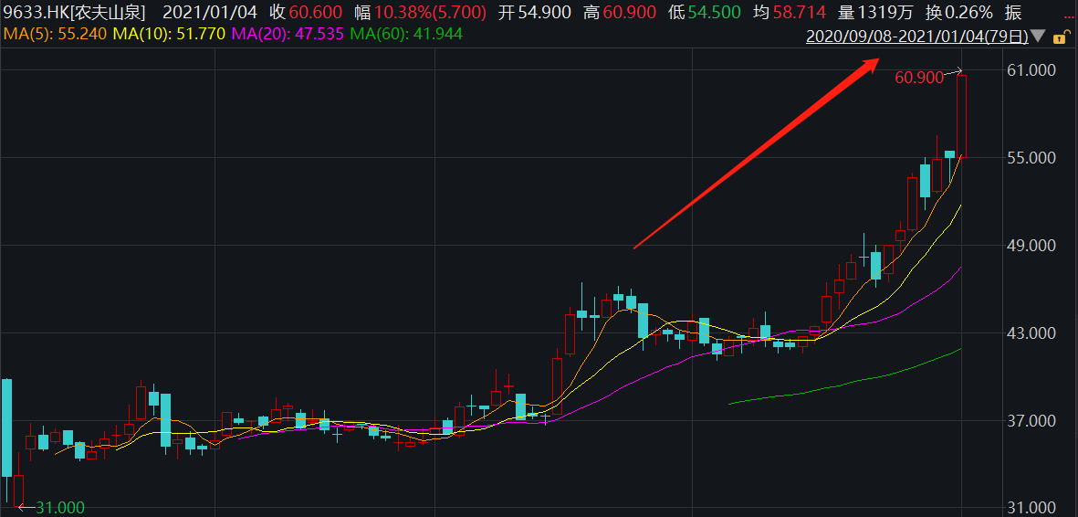 1月4日,农夫山泉持续走高,首次站上60港元,涨10.38%报60.6港元,最新市值6815亿港元。