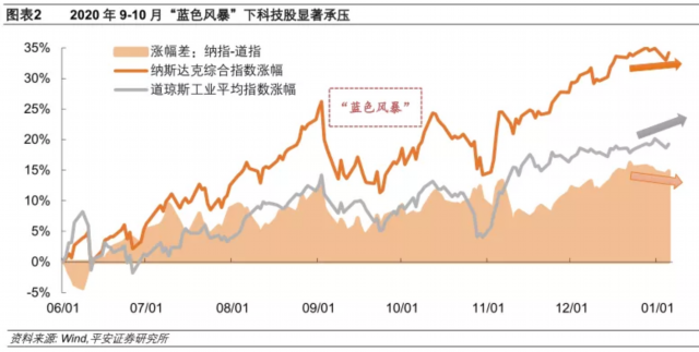 风格上,我们注意到2020年9-10月,美股在拜登当选预期下已掀起过一阵“蓝色风暴”,周期股呈迎头赶上态势,中小盘股的关注度也明显提升。不过,拜登胜选后,市场认为共和党控制参议院的概率较高,继而认为拜登对科技行业的“敲打”将受制约,“蓝色风暴”降格成“蓝色涟漪”。未来一段时间,美股的“蓝色”表现将增强,即科技等成长板块再受波及,而环保、新能源、基建等行业可能在民主党政策红利中有良好表现。节奏上,“浪潮”或没有此前的“风暴”来势迅猛,却很可能更加持久。伴随货币持续一段时间的宽松,预计美股会延续一段不错的上涨,整体上美股较美债更优。