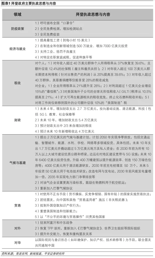 一方面,需要注意当前拜登的执政纲领比普通民主党人(和奥巴马时期的拜登自己)更加“进步”,主要表现为对赤字的谨慎度降低、拟增税幅度和范围均较大、大规模财政和基建计划、大力落实再分配政策……甚至在防疫政策上也颇有“大政府”风范(图表1)。这一点让市场对于其竞选承诺的落实程度持一定保留态度。另一方面,需要理解当前两党政客在部分问题上是有共识的,比如支持基建(特朗普此前亦有2万亿基建计划但尚未落实)、对贸易的态度都存在强硬部分(都重视“不公平贸易”问题),以及对华政策取向(两党议员多次联合发起对华遏制议案)等。就这些领域,“蓝色浪潮”不太可能“掀起波澜”。