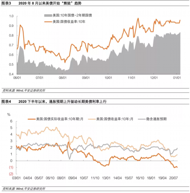 拜登领导的政府强化美国经济增长和通胀抬升的预期:1)拜登政府对防疫更加重视,对疫苗也很支持,美国疫情若得到有力防控,美国经济复苏环境会更优;2)拜登政府的财政规模更大,对经济的支撑更加精准;3)大规模财政与保持宽松的货币环境密不可分,在美联储新的平均目标通胀制下,一段时间的接近2%(甚至高于2%)的通胀水平将被允许,继而蓝色浪潮间接加强了通胀水平走高且持续更长时间的逻辑。此外,随着疫后美国经济复苏势头增强,美联储实施收益率曲线控制(YCC)的必要性也会有所下降,从而使得美债长短端保持一定利差。因此,“蓝色浪潮”或进一步助推未来的美债收益率上行和曲线趋陡。