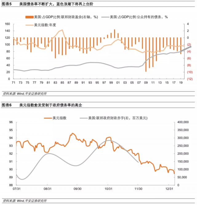 按照拜登竞选过程中提出的财政支出方案,未来10年财政赤字率将上一台阶,债务率也会进一步攀升。而近年来随着美国债务率的不断扩大,叠加今年疫情导致财政刺激大幅加码,对美国庞大债务的担忧开始对美元产生愈来愈大的压制。2)“蓝色浪潮”本身意味着拜登政府政策的不确定性降低(受共和党势力干预的可能性),且民主党防疫政策更有力、疫情控制前景更明朗,因疫情造成的不确定性也会下降,风险减弱时,具有避险属性的美元亦有走弱趋势。3)拜登执政思想包括对科技、资本和富人的征税或加强监管,更加注重美国经济的公平,对美元的支撑不如特朗普“美国优先”的理念强;也会对国际资本流入造成阻碍。