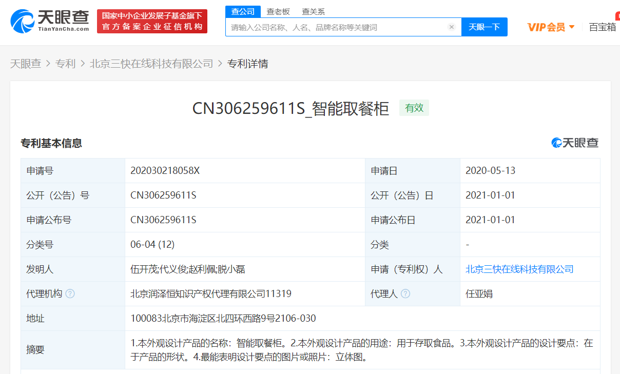天眼查App显示,美团的关联公司北京三快在线科技有限公司于2020年5月13日申请的智能取餐柜外观专利于2021年1月1日被授权,公开号为CN306259611S。智能取餐柜的用途是用于存取食品。