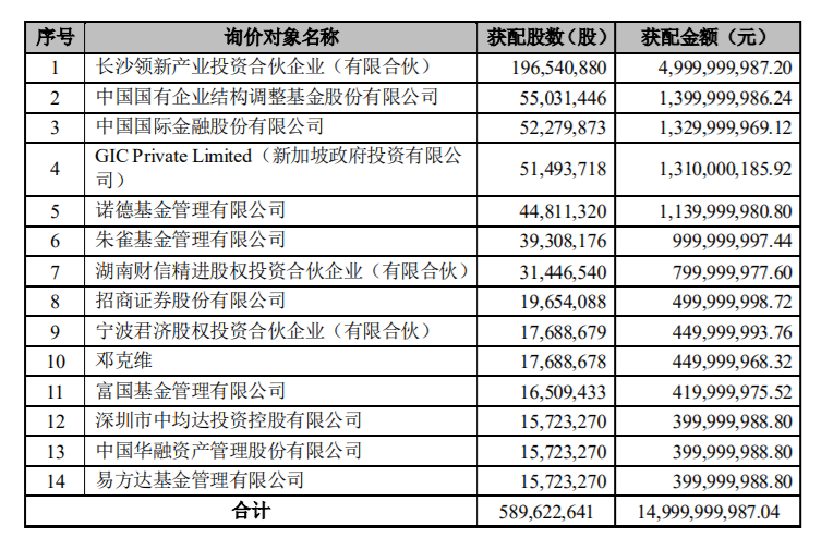 1月7日,蓝思科技发布向特定对象发行股票并在创业板上市发行情况报告书,本次发行的募集资金总额为150亿元,发行价格25.44元/股,共向长沙领新产业投资、中金公司、新加坡政府投资、诺德基金等14家机构发行5.89亿股。本次向特定对象发行股票发行对象认购的股份自发行结束之日起六个月内不得转让。