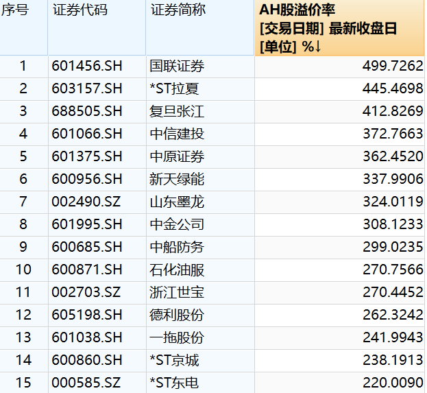Wind数据显示,1月7日恒生沪深港通AH股溢价指数收报141.09点,较前一交易日跌0.32%,共有8家公司AH溢价率超过300%。国联证券溢价率近500%,居于首位,国联证券H股今日收涨0.73%,报4.130港元。*ST拉夏、复旦张江溢价率居前,均超过400%。