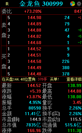 1月8日早盘,金龙鱼再度强势上涨,截至发稿,涨近4%,报144.52元,总市值达7835亿元,换手率2.26%。