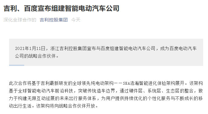 随后,吉利控股集团也在官方微信发文表示,将与百度组建智能电动汽车公司,成为百度电动汽车公司的战略合作伙伴。
