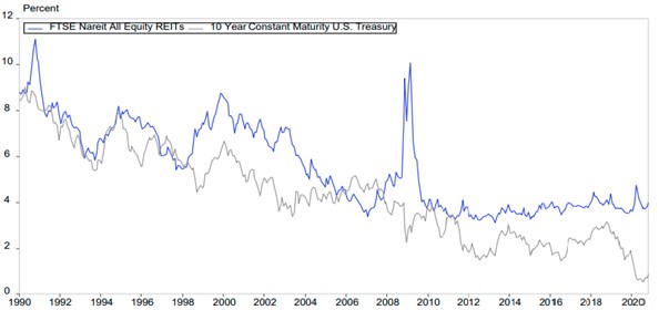 图:过去30年美国全股权型REITs指数收益率与十年期美国国债收益率