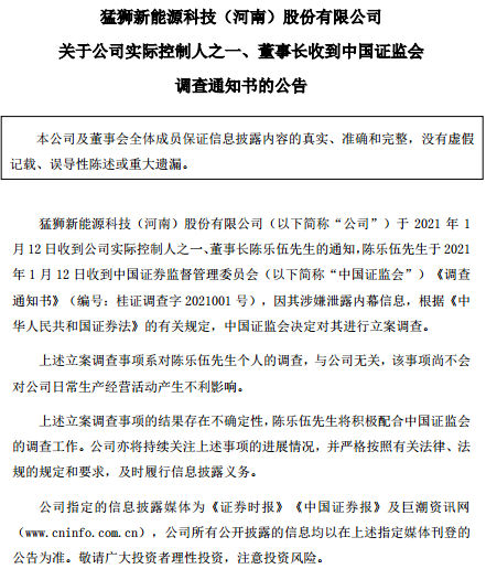 1月12日晚间,ST猛狮发布公告称,公司于2021年1月12日收到公司实际控制人之一、董事长陈乐伍的通知,陈乐伍于2021年1月12日收到中国证监会《调查通知书》,因其涉嫌泄露内幕信息,根据有关规定,中国证监会决定对陈乐伍进行立案调查。
