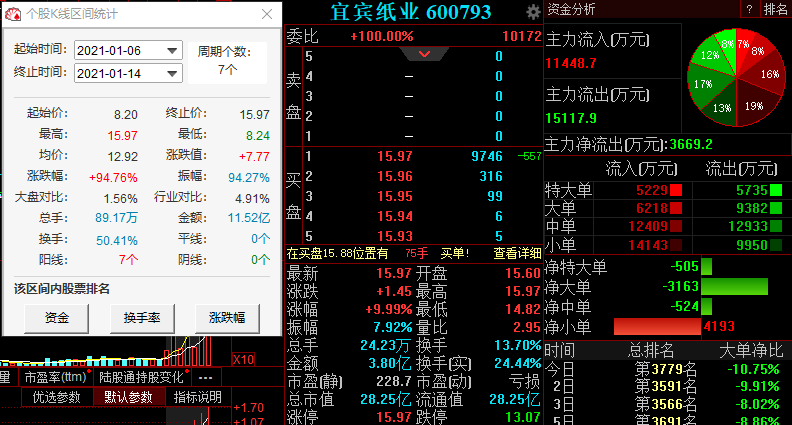 1月14日,宜宾纸业再度涨停,报15.97元,这也是公司斩获的第七个涨停板,累计涨幅达94.76%。