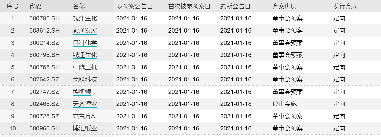 Wind数据统计显示,从2021年第二个交易周开始,上市公司首次披露定增预案的公司数量明显增多,1月12日~16日,共计有17家上市公司披露定增预案,16日单日披露定增预案的上市公司数量达8家,占当周总数50%,也超过了1月4日~8日披露定增预案企业数量的总和(7家)。