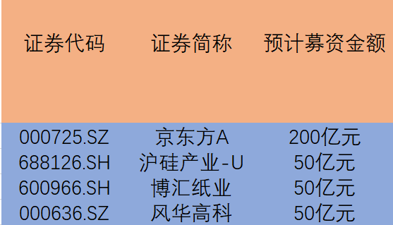 记者注意到,发布定增预案的企业相较以往更集中于半导体、新能源等新兴产业。沪硅产业(688126.SH)、京东方、博汇纸业、新强联(300850.SZ)均是各自细分领域的龙头企业,四家企业分别预计定增募资50亿元、200亿元、50亿元、14.6亿元。