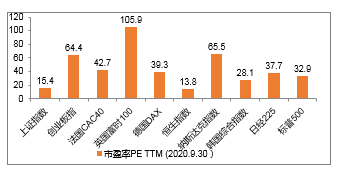 目前全球权益资产的洼地在港股和A股。截至2020年9月底,香港恒生指数的估值全球最低,上证综指也在15倍以下。创业板和纳斯达克市场的PE居全球首位,缘于其上市企业的高成长性。