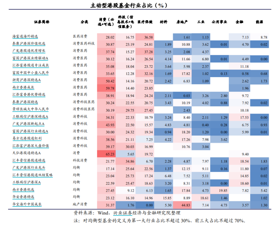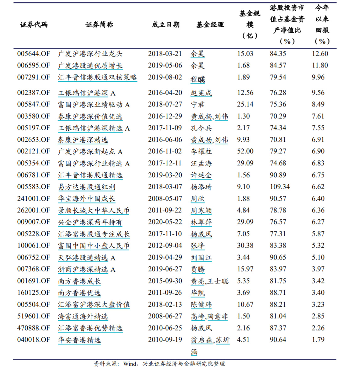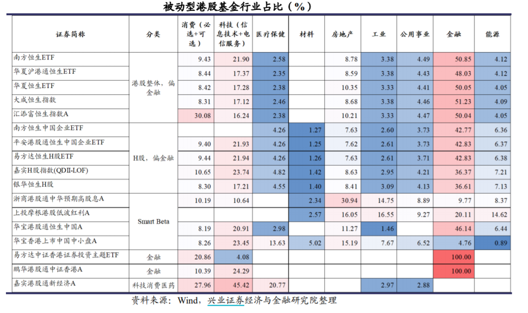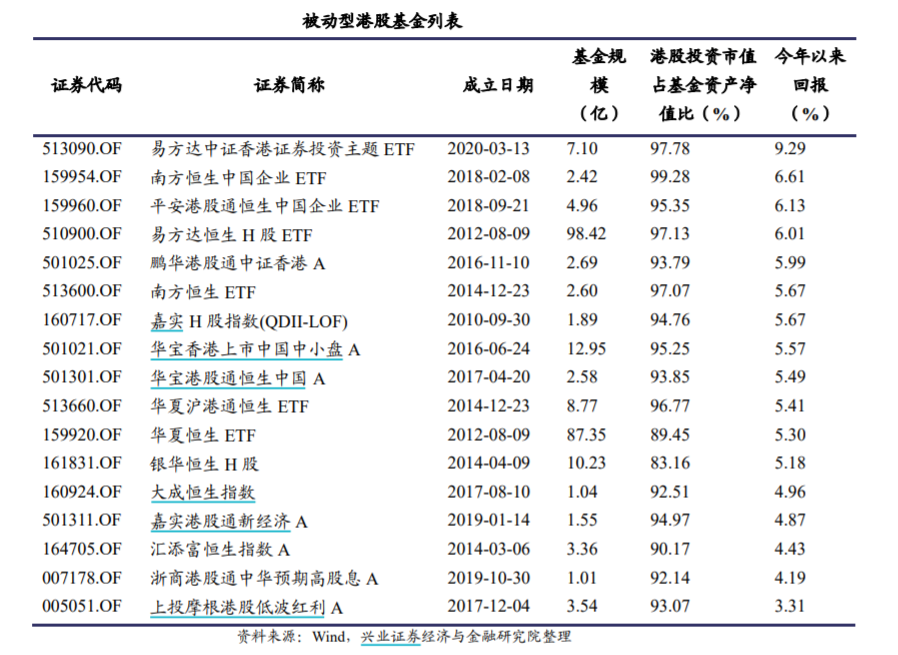 兴业证券整理了将主要仓位投资于港股市场的被动与主动基金。其中,筛选标准为最近一期港股投资市值占基金资产净值比例高于70%,且最新基金规模高于1亿。