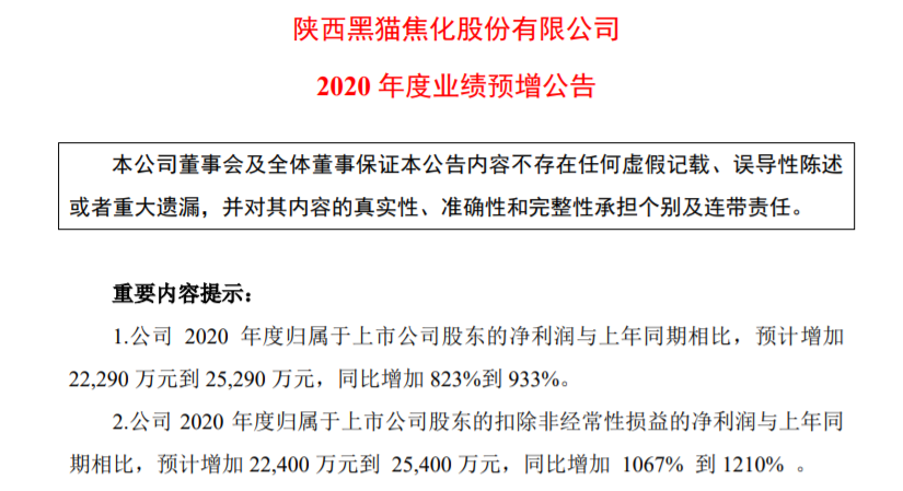 1月20日,陕西黑猫发布业绩预增公告称,预计2020年度实现归属于上市公司股东的净利润为2.5亿元到2.8亿元,与上年同期相比,预计增加2.23亿元到2.53亿元,同比增加823%到933%。