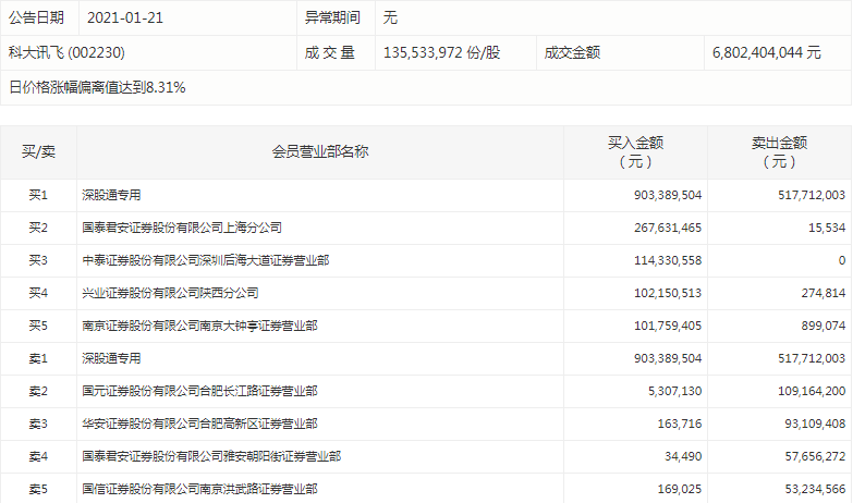 1月21日,科大讯飞涨停,截至收盘,股价报51.78元,全天成交逾68亿元,市值突破1100亿元。