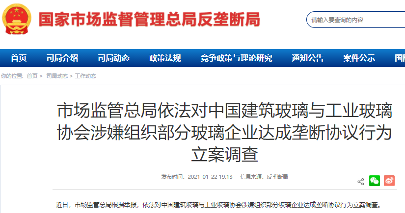 近日,市场监管总局根据举报,依法对中国建筑玻璃与工业玻璃协会涉嫌组织部分玻璃企业达成垄断协议行为立案调查。
