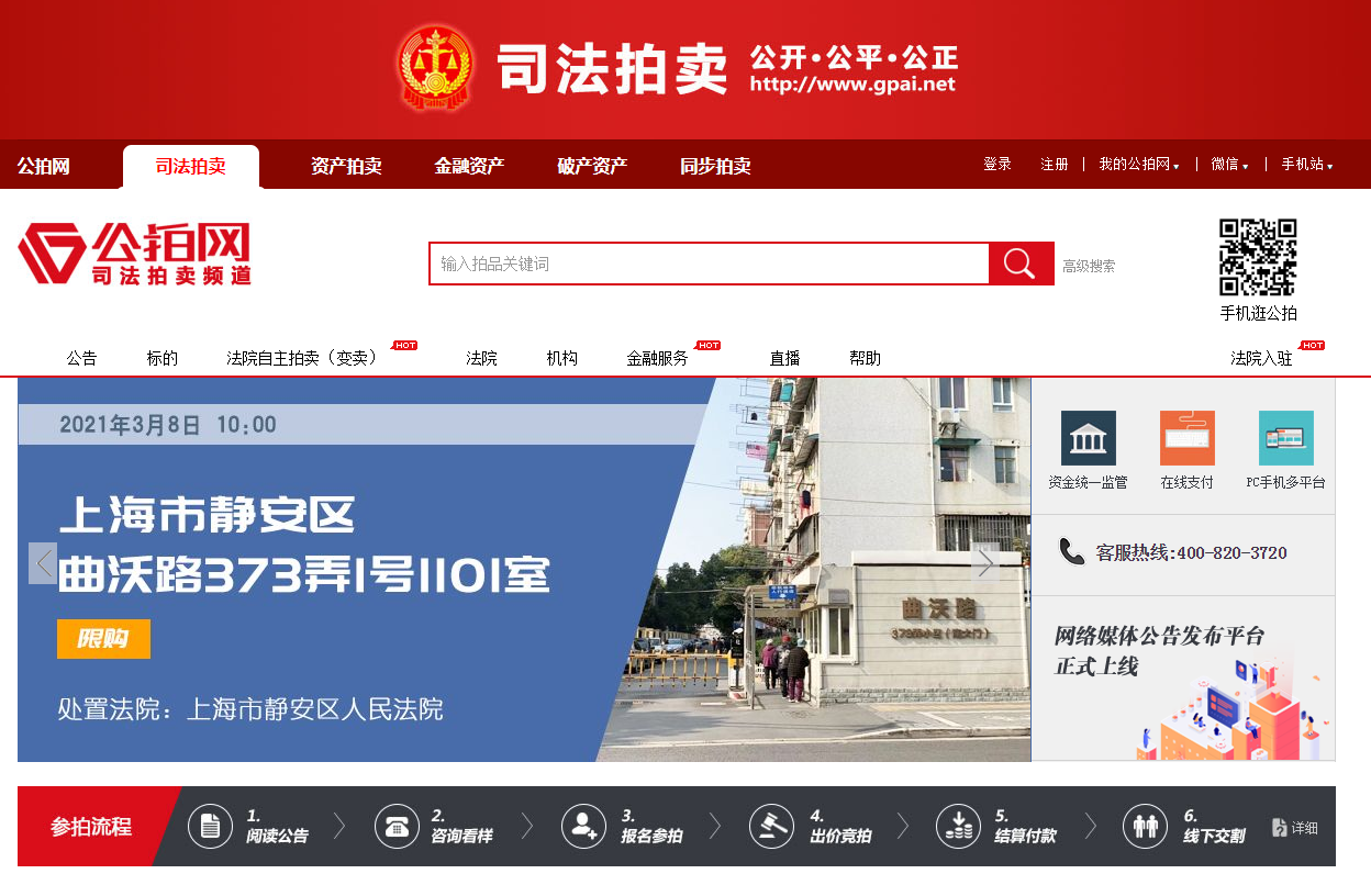 解放日报·上观新闻记者登陆公拍网发现,首页一套拍卖房源醒目标注了“限购”二字。该房源为上海市静安区曲沃路373弄1号1101室,将于3月8日10时拍卖,起拍价为286.5万元。