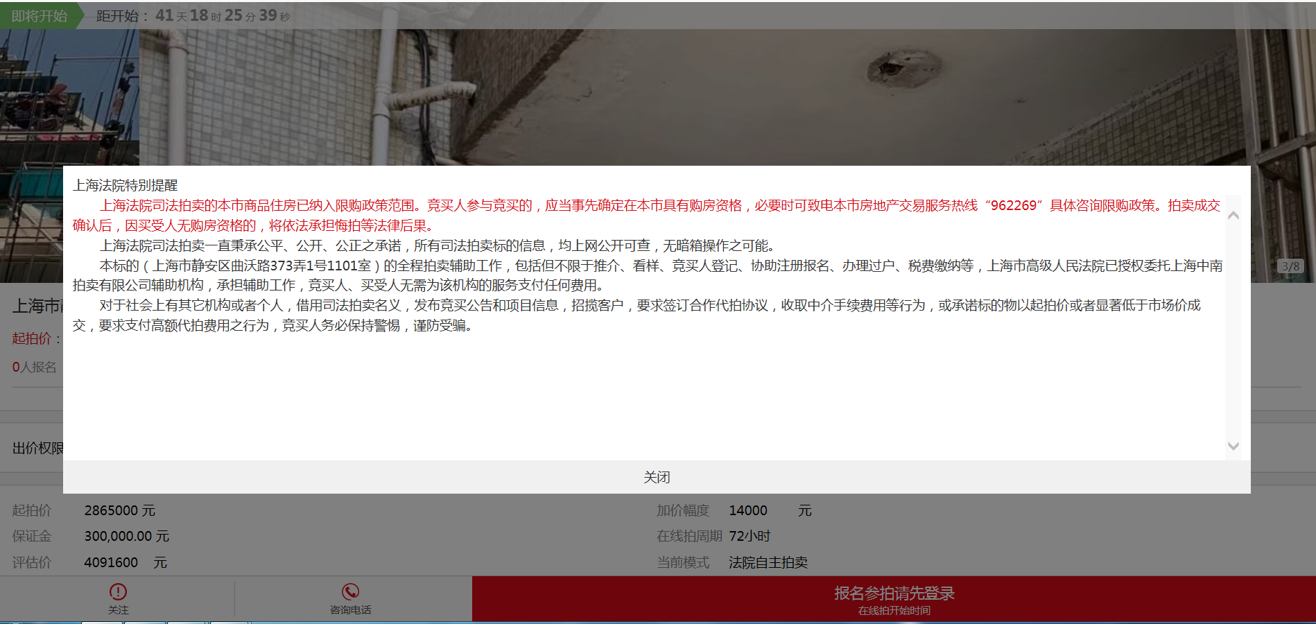 经记者向市房管局确认,该房源为上海法拍房纳入限购的首套房源。进入该房源链接,上海法院特别提醒:上海法院司法拍卖的本市商品住房已纳入限购政策范围。竞买人参与竞买的,应当事先确定在本市具有购房资格,必要时可致电本市房地产交易服务热线“962269”具体咨询限购政策。拍卖成交确认后,因买受人无购房资格的,将依法承担悔拍等法律后果。