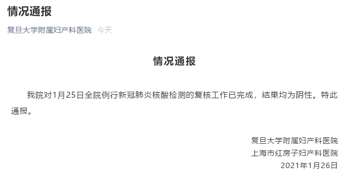 1月26日凌晨,复旦大学附属妇产科医院(上海红房子妇产科医院)发布情况通报:该院对1月25日全院例行新冠肺炎核酸检测的复核工作已完成,均为阴性。