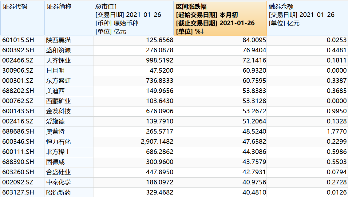 本月至今累计涨幅居前的个股是:陕西黑猫(+84%)、盛和资源(+76%)、天齐锂业(+72%)、日月明(+60%)、东方盛虹(+60%)等。本月累计跌幅居前的个股是:美好置业(-49%)、华安鑫创(-41%)、南极电商(-36%)、长春燃气(-36%)、东方时尚(-34%)等。