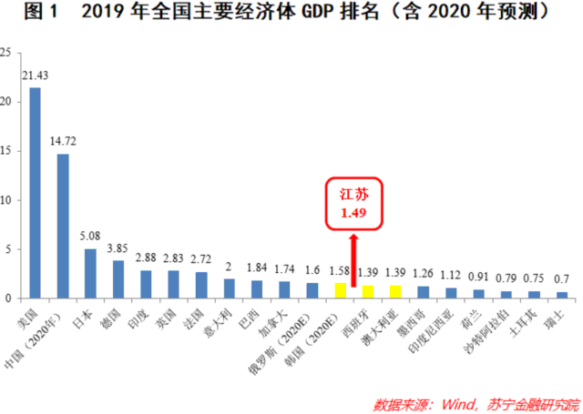 可以清晰地看到,江苏2020年的GDP数值超过了2019年的西班牙和澳大利亚,直追2020年的韩国。如果江苏省有资格参与排名的话,那么它应该处在全球第13位,凌驾于世界180多个国家之上。