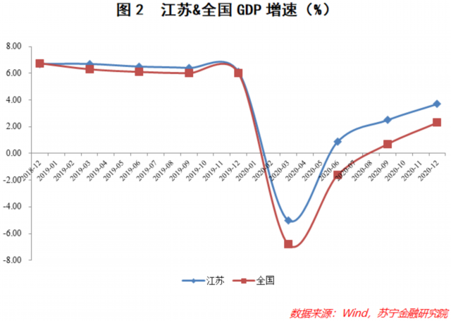 数据显示,江苏2020年第二季度就实现了GDP增速的由负转正,全年更是创下了3.7%的增长幅度,显著高于全国整体水平(见图2),彰显出强大的经济韧性。